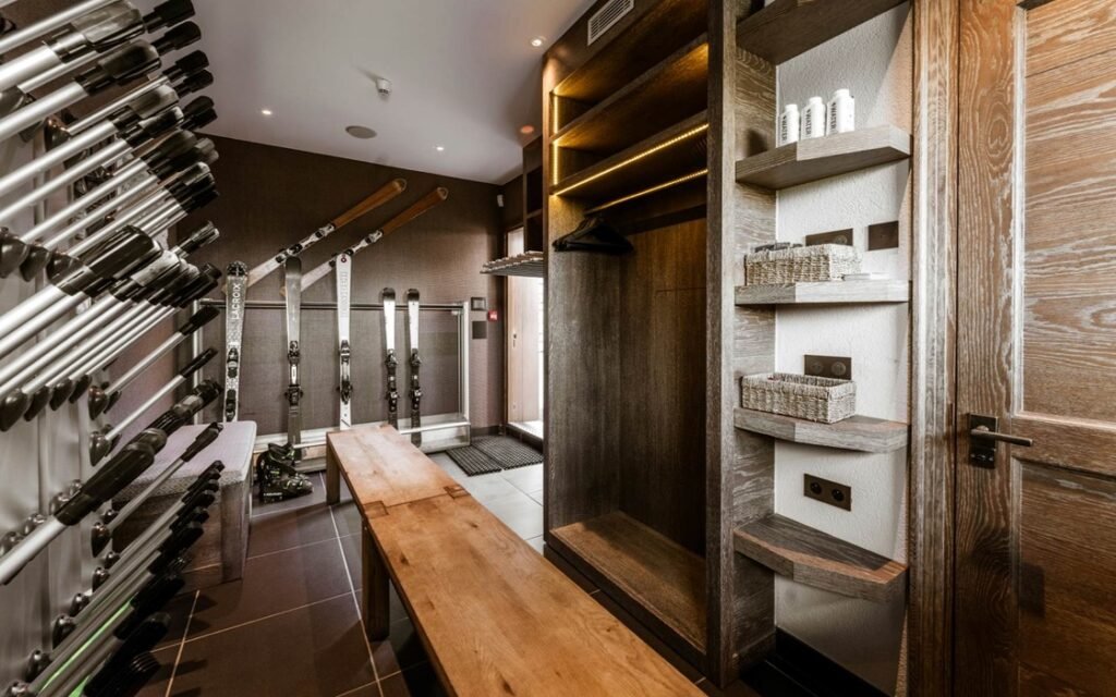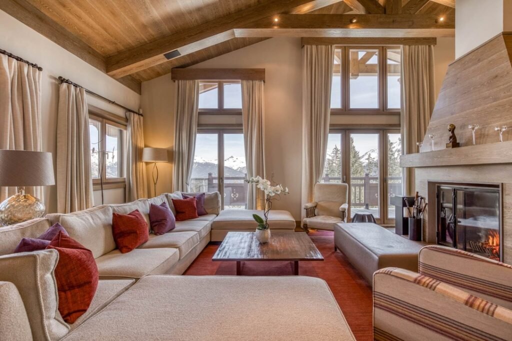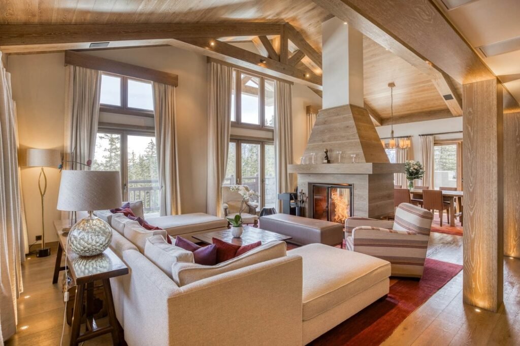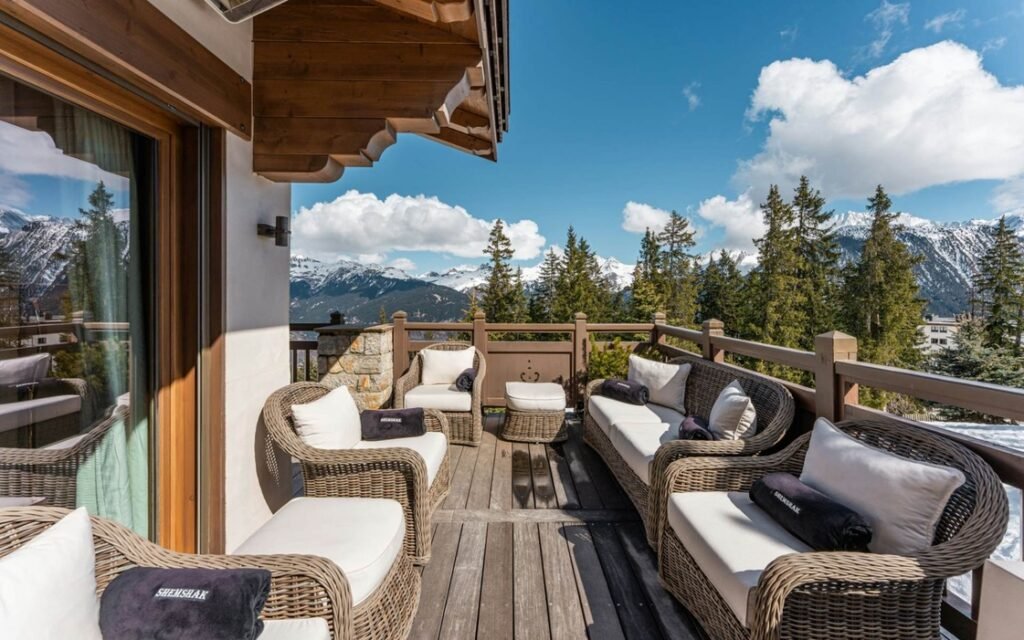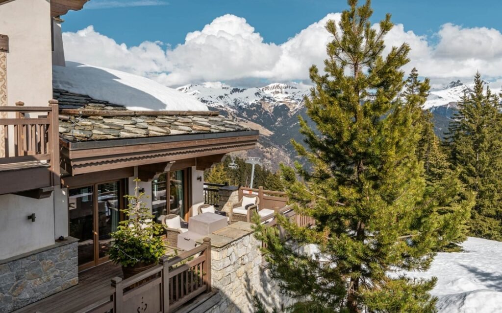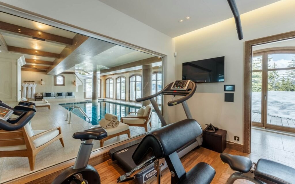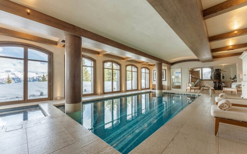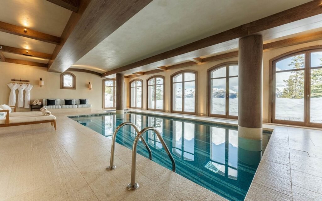 The imposing chalet, nestled on a snowy slope and lined with balconies, offers breathtaking views of the mountains. The interiors are equally lavish, with a ground floor wholly dedicated to well-being, comprising a swimming pool, a jacuzzi, a sauna, a hammam, and a fitness room, all with panoramic views of the surrounding valley.