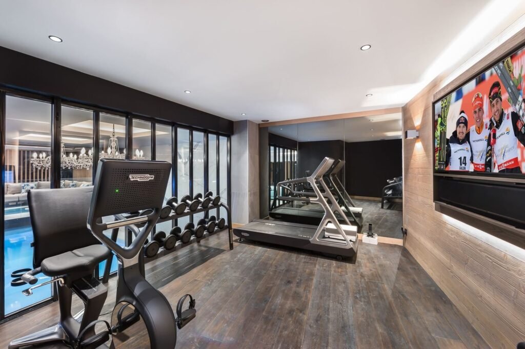 Le salon contemporain avec cheminée crée une ambiance chaleureuse en hiver, tandis que la salle à manger élégante et la cuisine professionnelle sont parfaites pour des moments conviviaux. Le design alpin moderne se marie harmonieusement avec des éléments en bois, béton brut et touches de laiton, offrant une atmosphère relaxante.